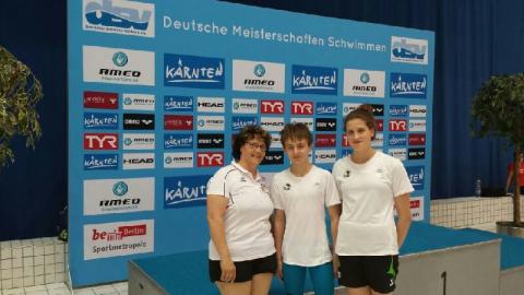 Mitten drin im Leistungsvergleich der besten Deutschen Schwimmer/innen waren auch unsere Eberswalder Sportler/in Jule Rathmann (Jg. 2002), Robert Böhm (Jg. 2003) und Moritz Haase (Jg. 2001), der mit Aufbauarbeit in der Sportschule Potsdam immer noch seinem „alten“ Verein die Treue hält. Jule und Robert erarbeiteten sich ihren hohen Trainingsstand und damit ihre Qualifizierungen zur DJM durch ein regelmäßiges und diszipliniertes Training (4 mal/Woche) sowie durch zusätzliche Trainingslager in Sonneberg und Rabenberg – stets unterstützt durch Ihre Trainerinnen Frau Borchert und Frau Marschalek.