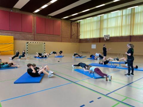 Alle Sportlerinnen und Sportler, auch diejenigen die neu im Trainingslager dabei sind, sind mit dem Ablauf eines Trainingstages vertraut. Die Staffelei mit einem täglich neu entworfenen Motiv gibt zusätzliche Orientierung im Detail, insbesondere welche Gruppe sich wann und wo einzufinden hat. So ging es für die jüngeren Trainingsgruppen heute Morgen zum Schwimmen, die erfahreneren Trainingsgruppen starteten in der Turnhalle mit einem Kraftkreis. Anschließend wurde gewechselt.