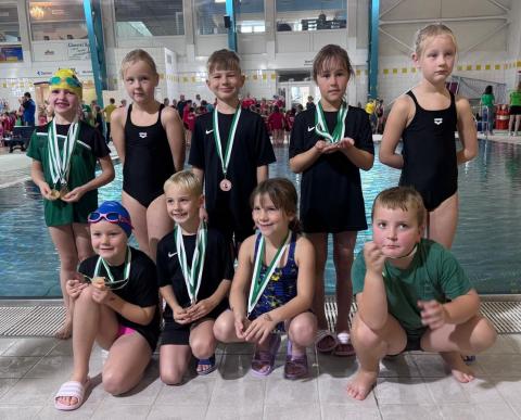 Beim Wettkampf über 25m Rücken der 7-jährigen Mädchen schwammen 30 Schwimmerinnen! Dass unsere Mädchen Jolanda Stelse, Hannah Skiback und Hilda Schlüter dort die Plätze 3, 4 und 8 erkämpfen konnten, ist schon eine tolle Leistung. Auch die beiden jüngsten Starter (Jg.2019) Jakob Hrymon und Hermine Wenzlaff sorgten für mehrere Podestplätze unseres Vereins. Beide sicherten sich bei vier Starts auch vier Medaillen. Seine erste Medaille bei einem „großen“ Wettkampf errang Leon Hoffmann. Durch regelmäßiges Training konnte er im Brustschwimmen seine Leistung verbessern und stolz die Bronzemedaille in Empfang nehmen. Emma und Frieda Müller starteten als Wettkampfneulinge in Fürstenwalde. Alle Abläufe und Besonderheiten eines so aufregenden Tages werden sie in den nächsten Monaten sicher noch weiter üben, um beim nächsten Mal vielleicht auch auf das Siegerpodest steigen zu dürfen. Ein erfahrener Schwimmer ist dagegen Emil Ullrich. Über die Bruststrecke erkämpfte er sich seine Podestplatzierung. Hier konnte er starke technischen Verbesserungen über die anspruchsvolle Lage nachweisen.